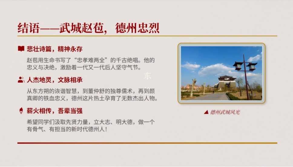袁老师总结道:“东方朔教我们幽默与智慧——做人要有趣;董仲舒教我们专注与担当——做事要专注;颜真卿教我们忠义与坚守——立身要有骨;赵苞教我们守正与抉择——处世要有义。德州这片土地,走出了智圣、儒宗、忠烈、义士。作为在德州求学的学子,我们为此自豪,更要以此自勉!”