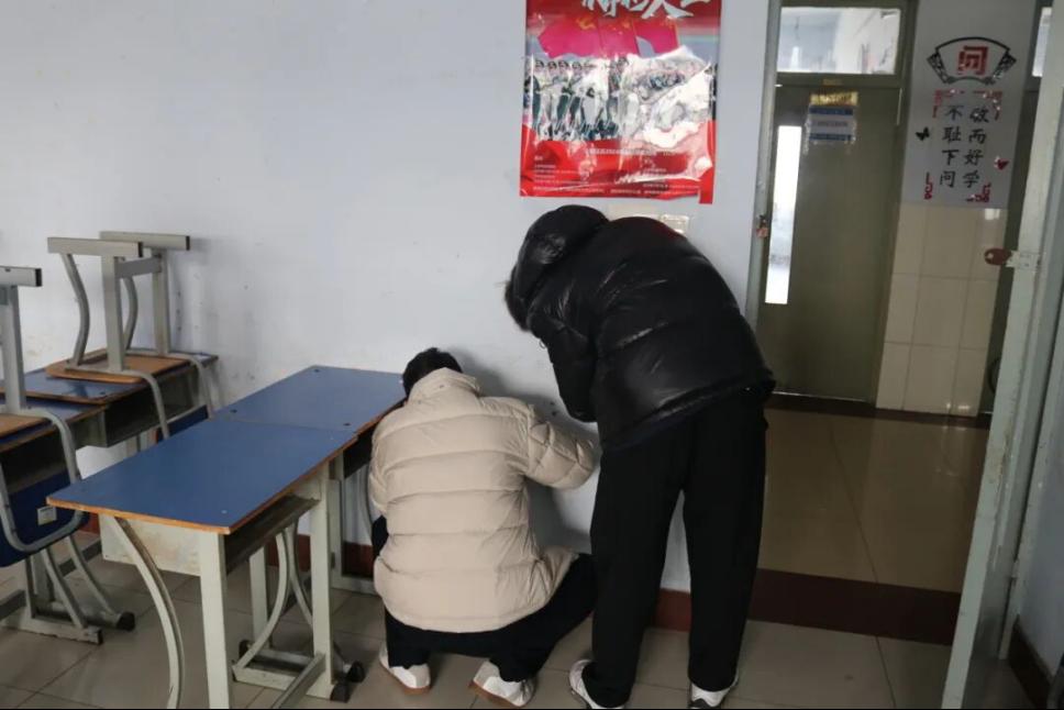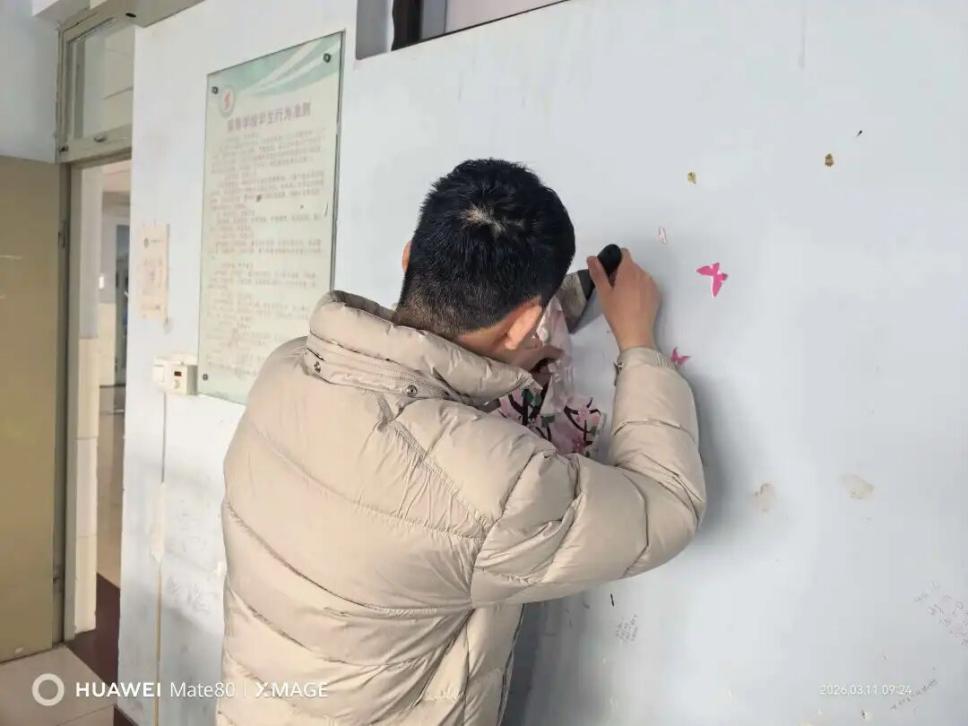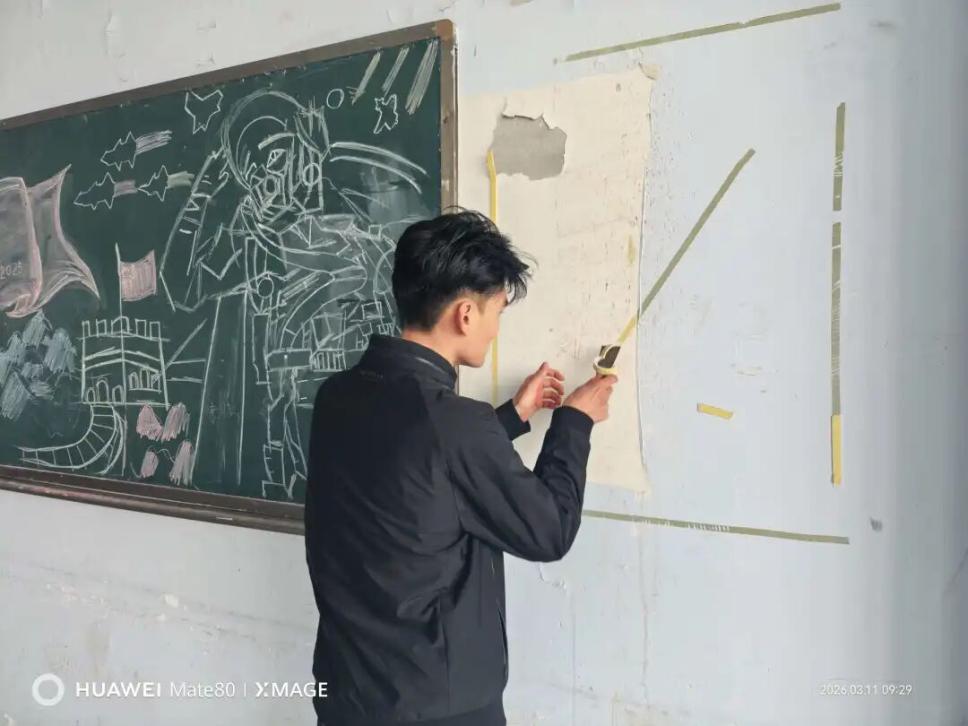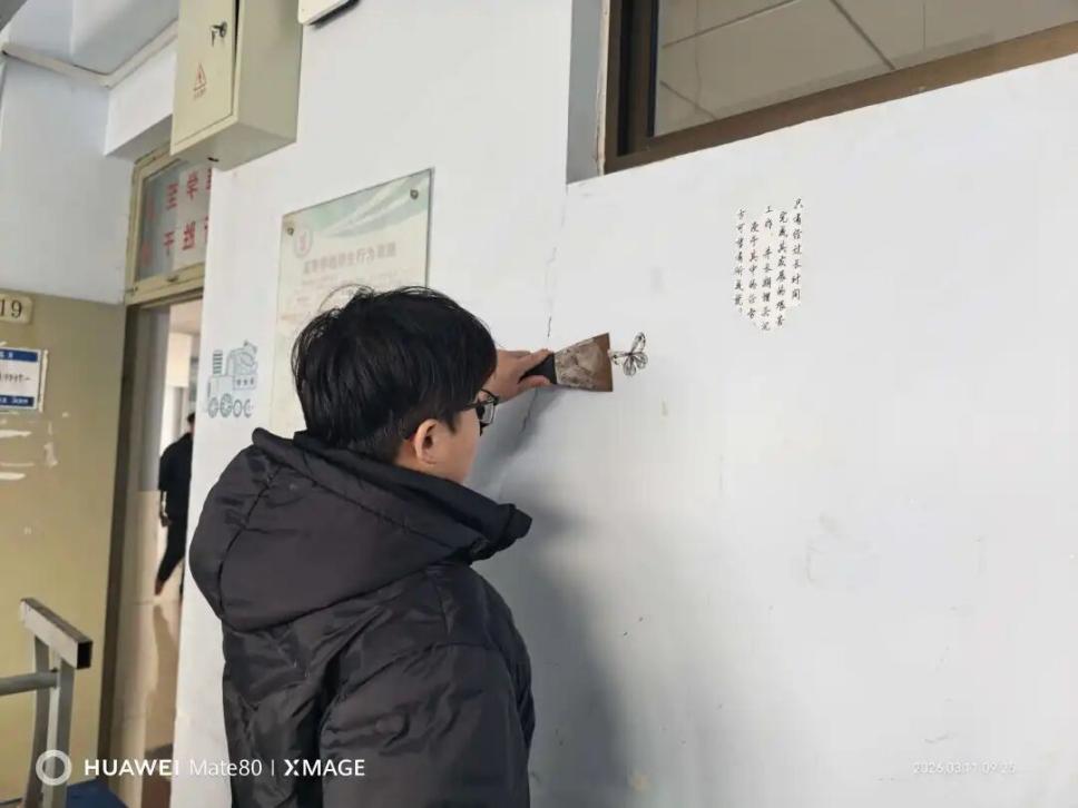 活动过程中,同学们展现了汽车工程系学生特有的严谨与细致。面对墙面上顽固的双面胶、泡沫胶残留,大家并没有简单应付,而是先用喷壶将墙面润湿,再用小铲子小心翼翼地一点点铲除,既要保证胶带被彻底清理,又要确保墙面涂层不受损坏。除了清理胶带,针对极少数课桌和墙壁上的乱涂乱画字迹,同学们也进行了耐心的擦拭和覆盖处理。虽然清理工作繁琐且枯燥,但看着原本斑驳的墙面逐渐恢复洁白,每一位参与者的脸上都露出了欣慰的笑容。