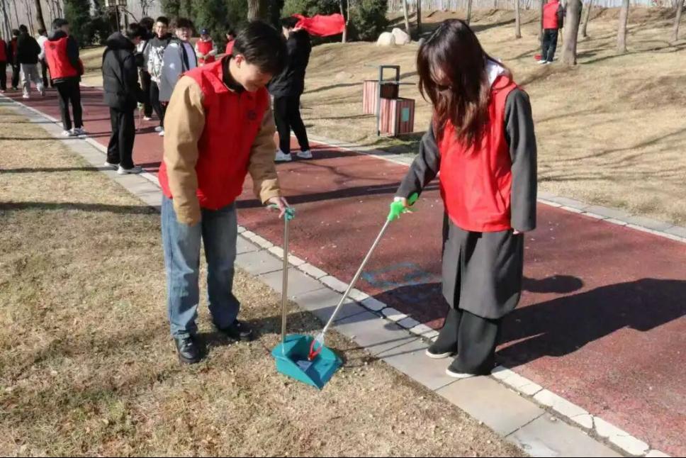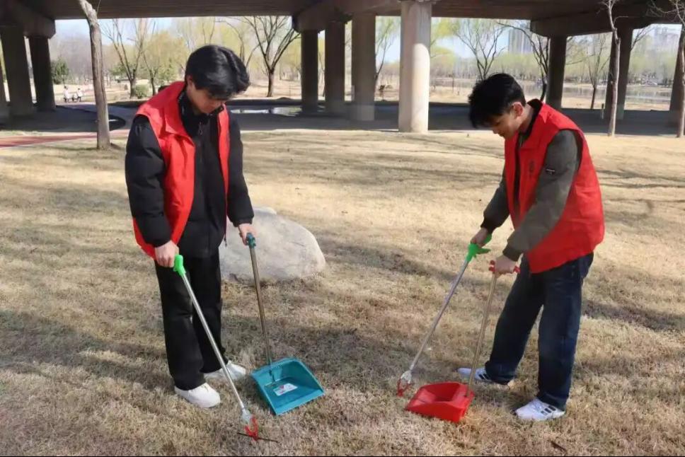 随着春日的减河湿地公园游人渐多,步道上的落叶和垃圾也相应增加。志愿者们手持垃圾钳、垃圾袋等工具,沿着公园栈道仔细清理步道、草坪及河岸两侧的落叶与垃圾,认真细致、分工协作,不放过任何一个角落,用汗水和热情守护着湿地的洁净与美丽。忙碌的志愿服务间隙,王猛老师与同学们一同驻足欣赏湿地春景,感受大自然的生机与馈赠。师生们在劳动之余沉浸其中,身心得到极大放松,也更加坚定了守护绿水青山、践行雷锋精神的信念与责任。