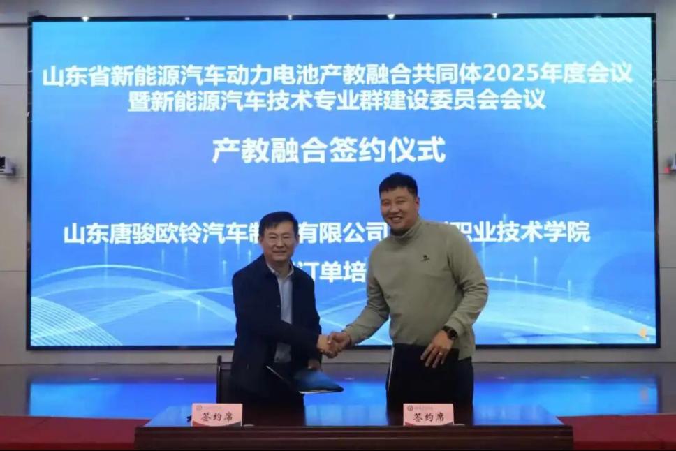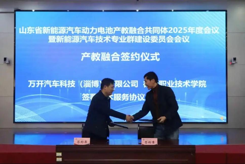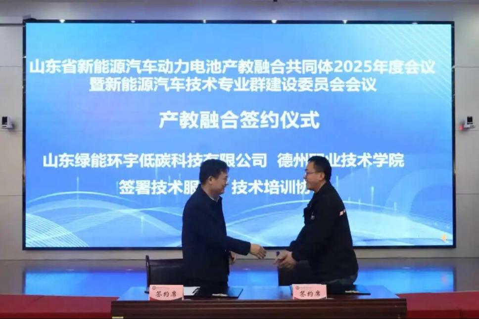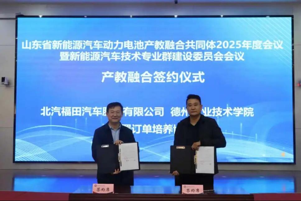 在产教融合签约仪式环节,德州职业技术学院分别与山东绿能环宇低碳科技有限公司、北汽福田汽车股份有限公司、山东唐骏欧铃汽车制造有限公司、万开汽车科技(淄博)有限公司签署产教融合合作协议,涉及技术服务、技术培训、订单培养等多个领域。此次签约标志着校企双方在资源共享、优势互补、协同发展方面达成深度共识,将为新能源汽车产业培养更多高素质技术技能人才。