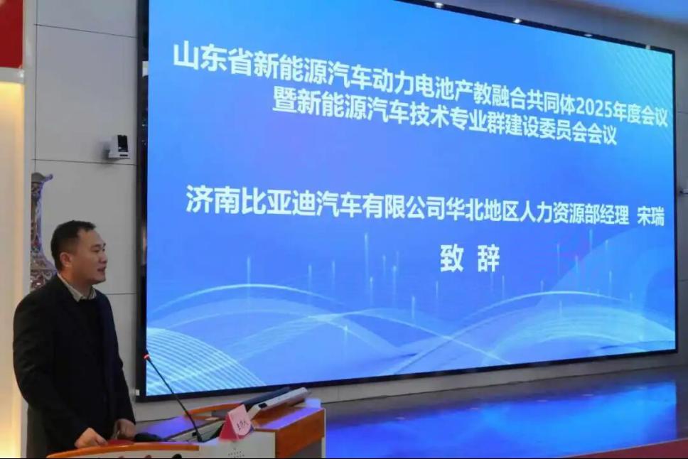 会议伊始,主持人艾锋隆重介绍了出席本次会议的各位领导与嘉宾,并对各方代表的到来表示热烈欢迎。随后,山东理工大学交通与车辆工程学院副院长史立伟、济南比亚迪汽车有限公司华北地区人力资源部经理宋瑞先后致辞,分别从高校人才培养、企业产业需求等角度,阐述了产教融合对新能源汽车产业发展的重要意义,表达了深化校企合作、实现共赢发展的强烈意愿;李强部长在致辞中回顾了学校深耕产教融合、推动共同体建设的丰硕成果;艾锋主任在2025年度工作总结中,系统梳理了共同体过去一年在多方面取得的工作成效,明确了下一步深化产教融合的重点方向。