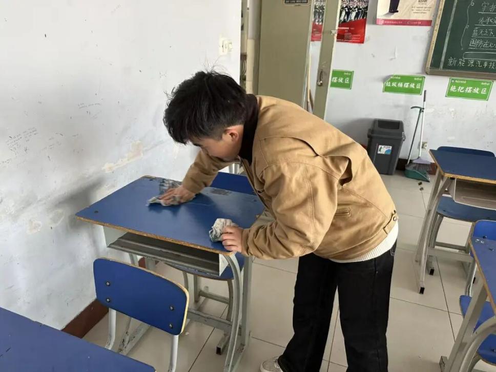 活动现场,同学们分工协作,分为两组同步推进宿舍通风与教室打扫工作。宿舍区域,大家逐间排查、开窗通风,检查门窗完好情况,确保空气对流,改善宿舍空气质量;教室区域,同学们手持工具清洁地面、桌椅、黑板,清理卫生死角,同步开窗通风,全力营造整洁健康的学习环境。